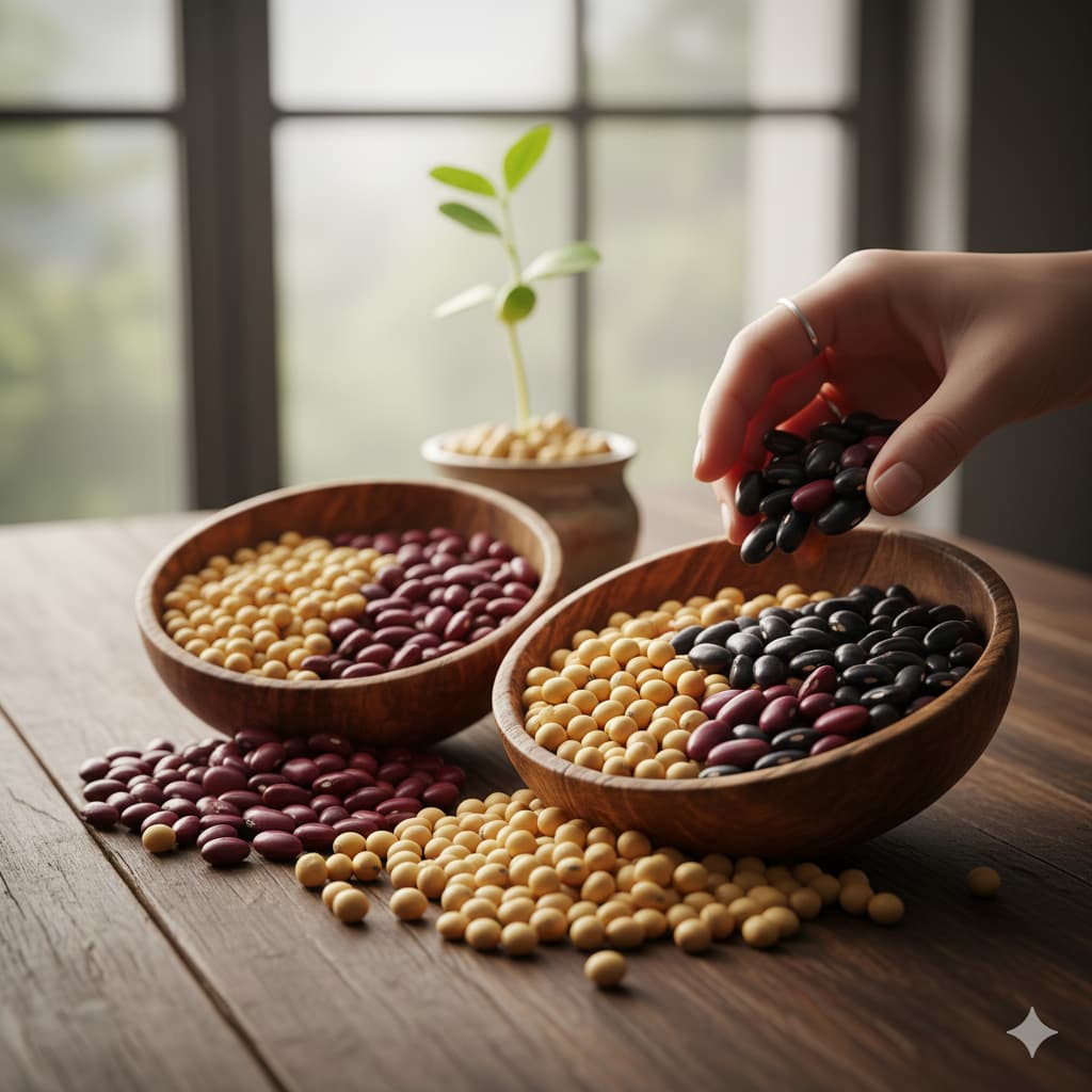 모든 콩이 동일한 영양을 제공하는 것은 아닙니다. **검은콩(서리태)**은 안토시아닌이 많아 탈모 예방과 노화 방지에 최적화되어 있고, **대두(백태)**는 이소플라본 함량이 가장 높아 두부나 간장 제조에 적합합니다. **강낭콩**은 비타민 B군과 식이섬유가 풍부해 피로 해소에 좋으며, **완두콩**은 비타민 A가 많아 시력 보호에 효과적입니다.